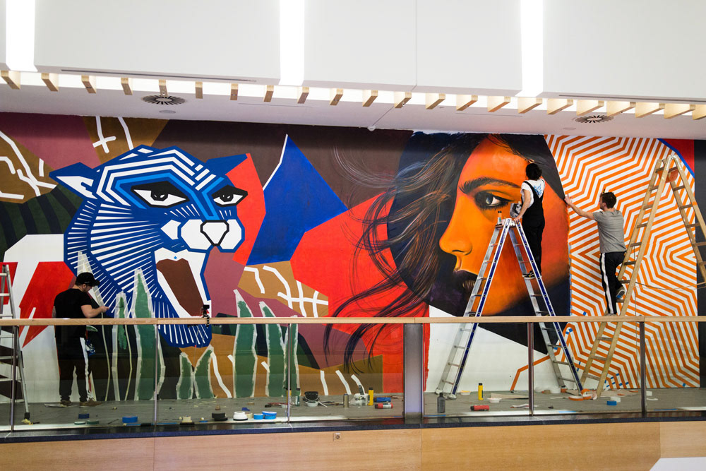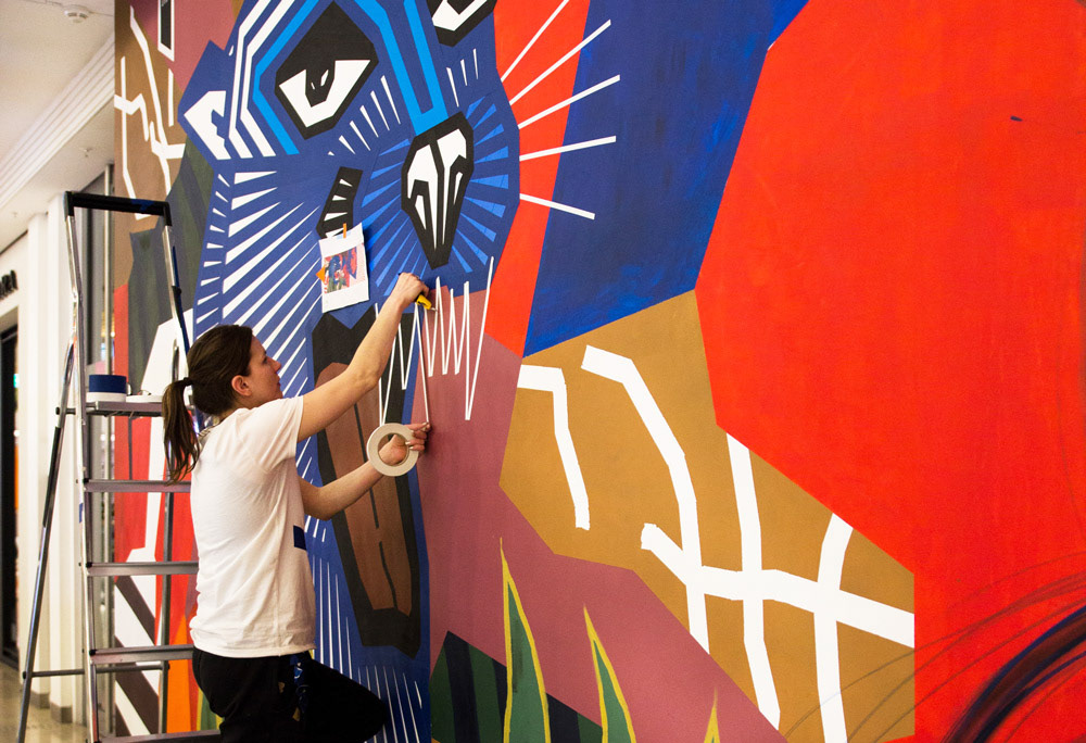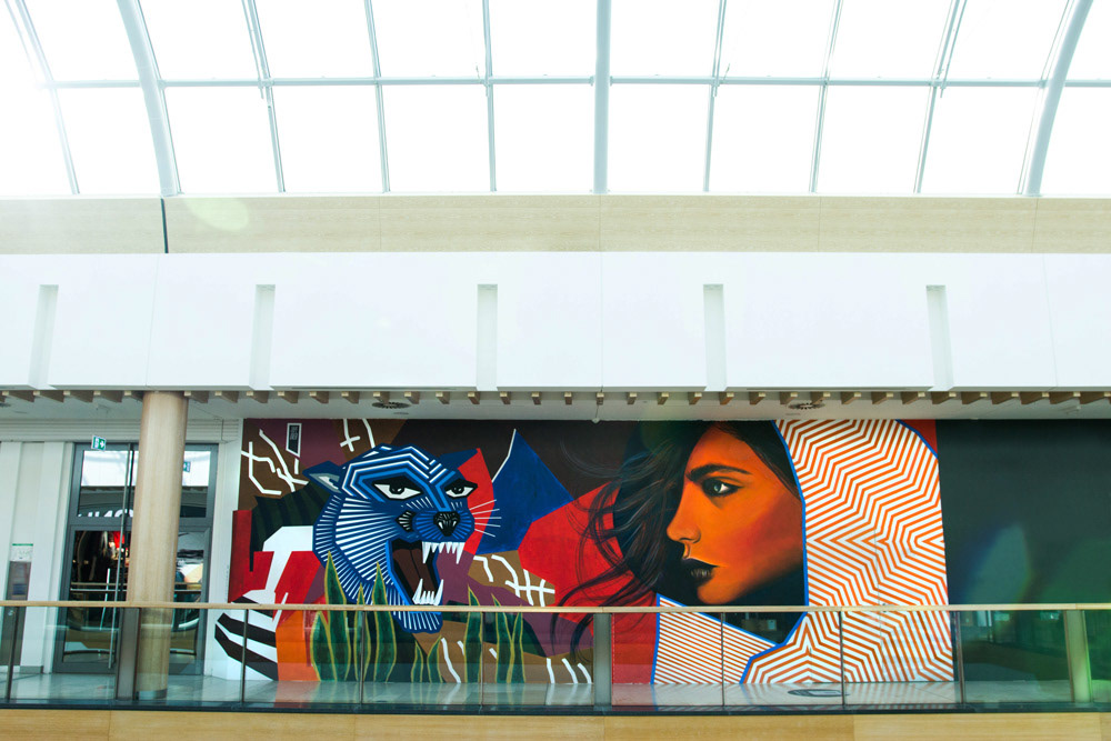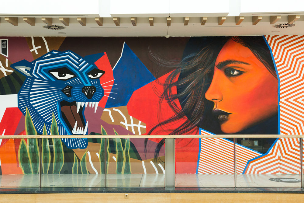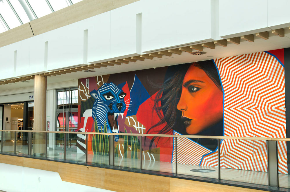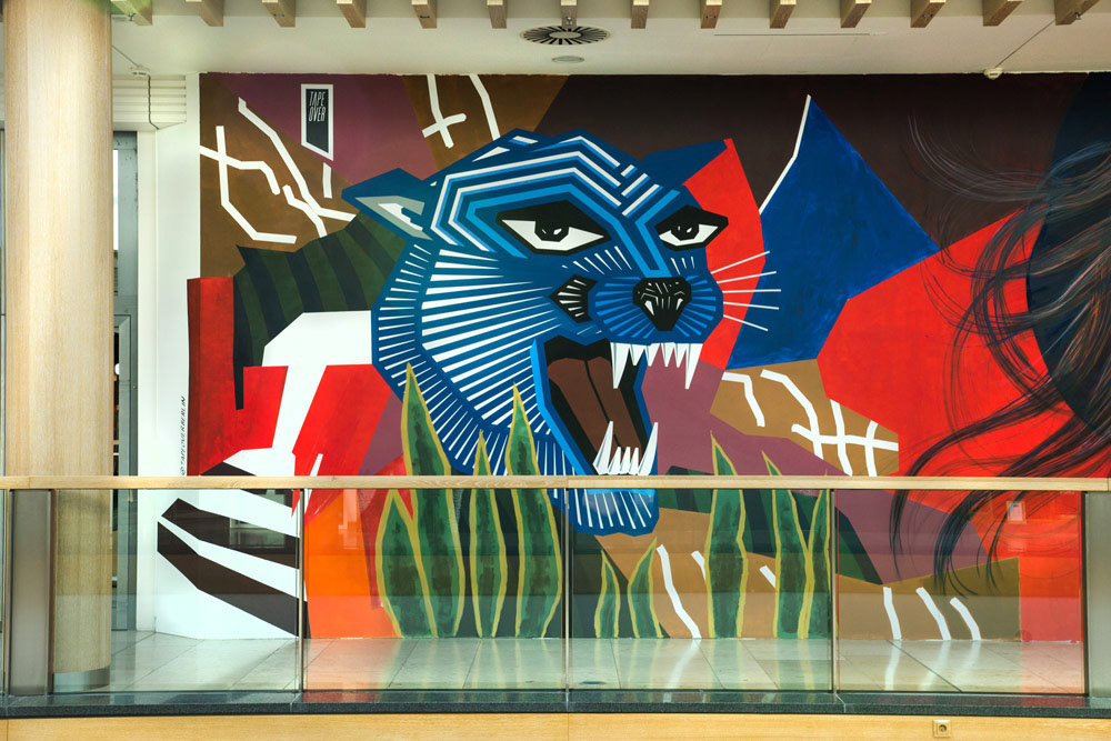 This is a mixed art mural combining tapeart, painting and graffiti. We created this mixed media artwork titled SPIRIT ANIMAL at the Riem Arcaden in Munich.