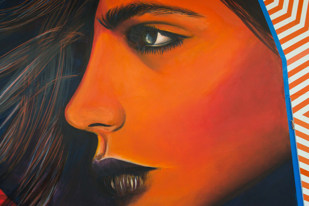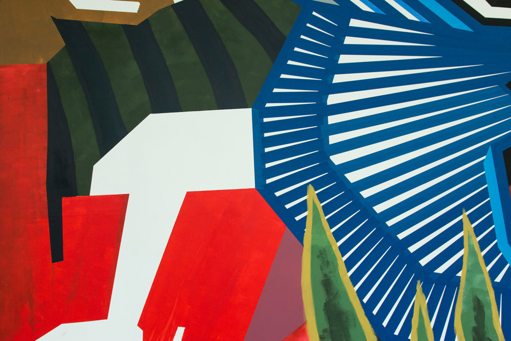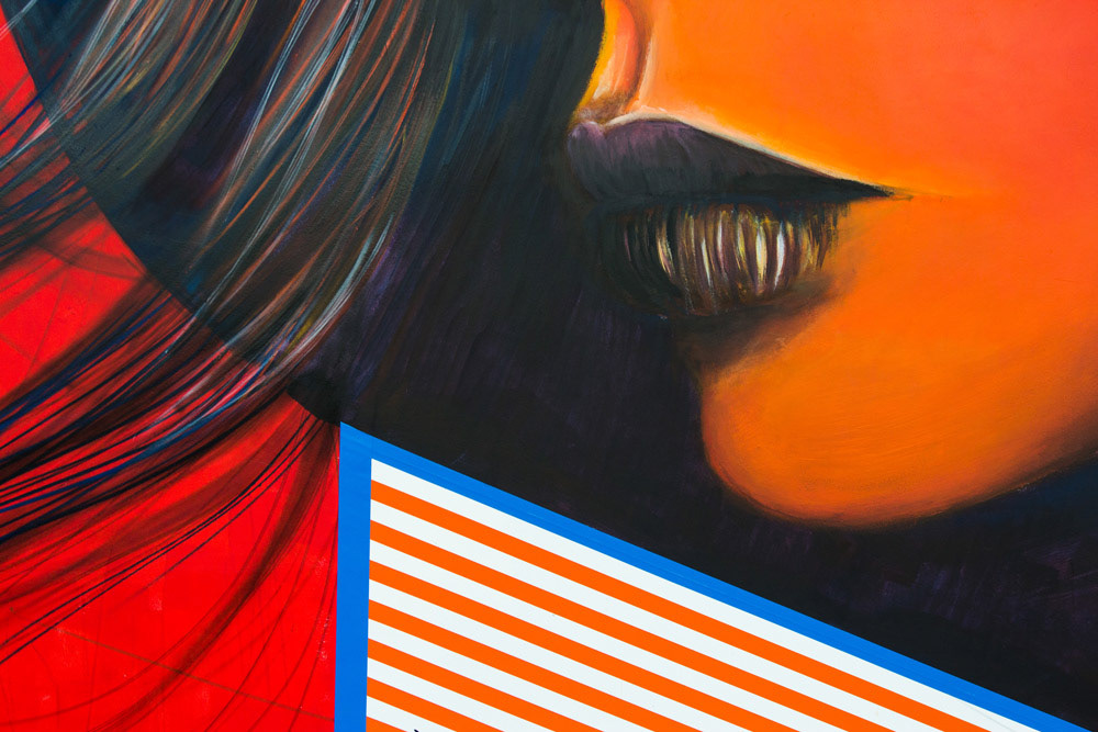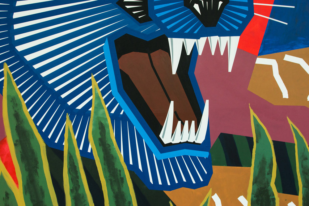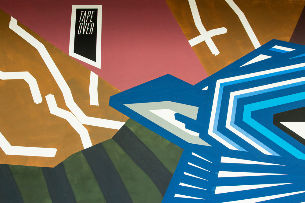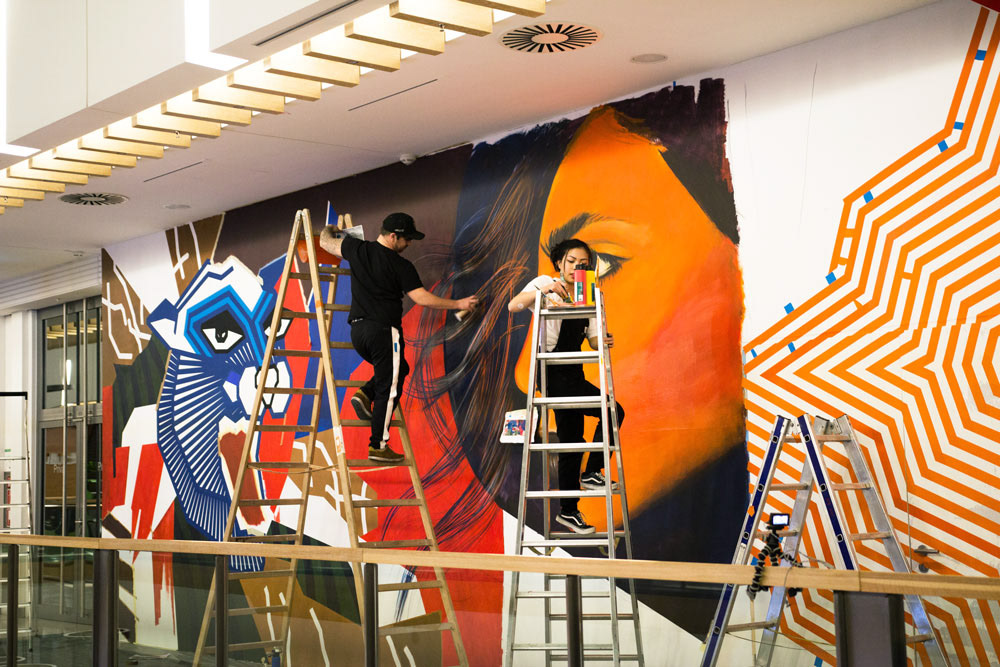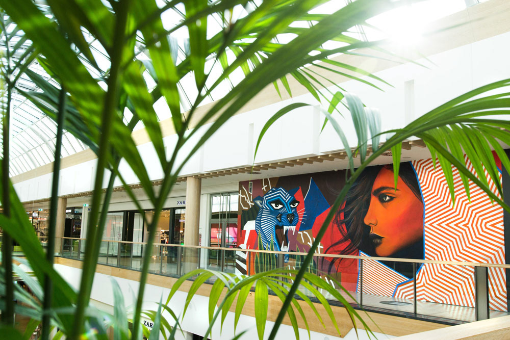 This is a mixed art mural combining tapeart, painting and graffiti. We created this mixed media artwork titled SPIRIT ANIMAL at the Riem Arcaden in Munich.
