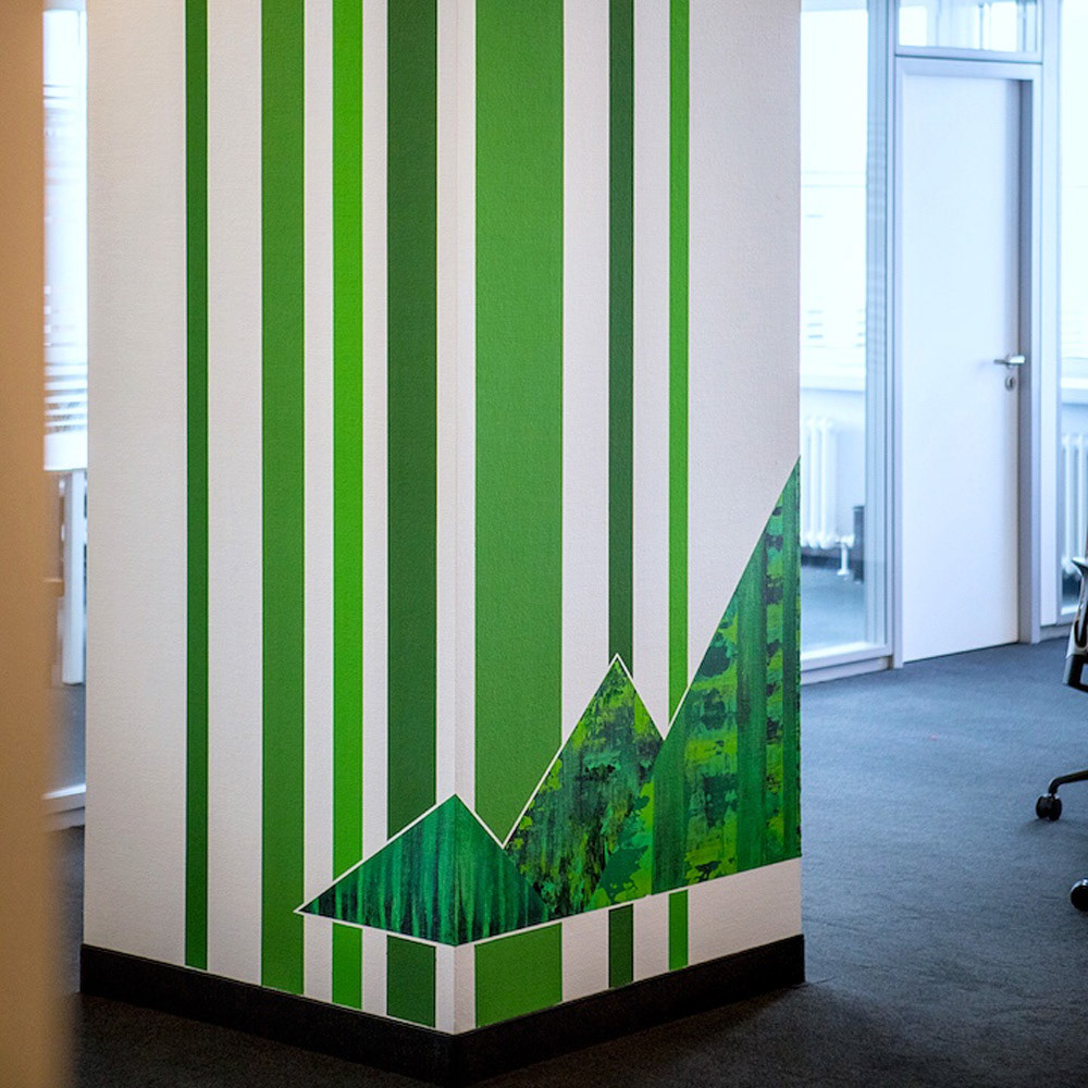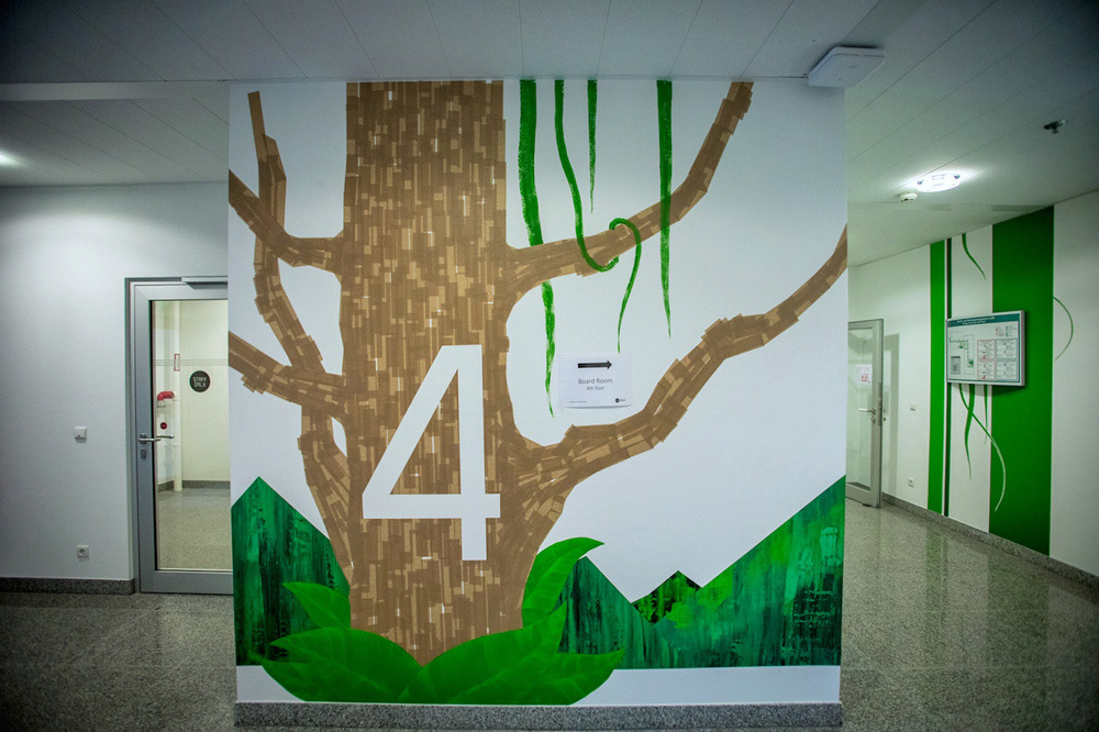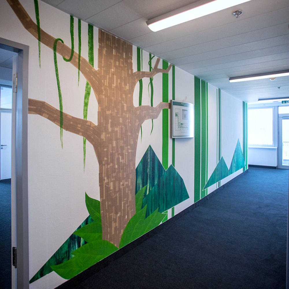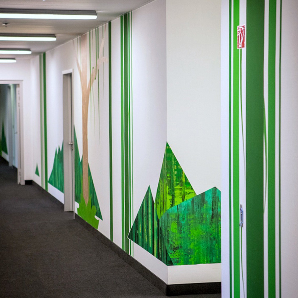 This is floor 4 inside H:32 - an office building for start-ups in the center of Berlin. We were asked to design several floors of this building. Thus, we decided to show our full artistic range. The topic of this floor is forest. We combined TAPE ART, PAINTING and SPATULA to create an organic but abstract office design.
