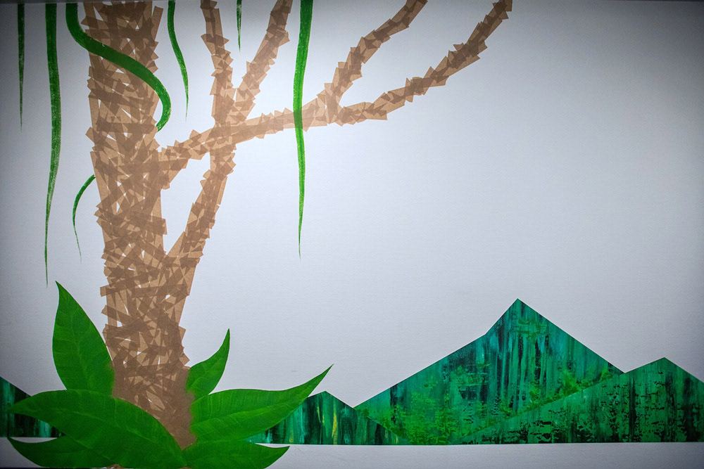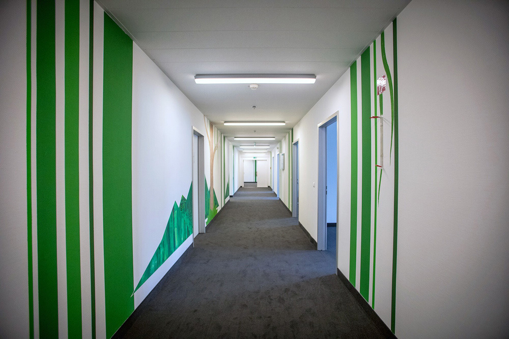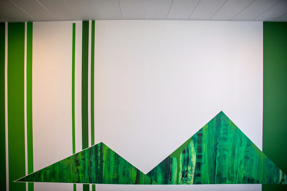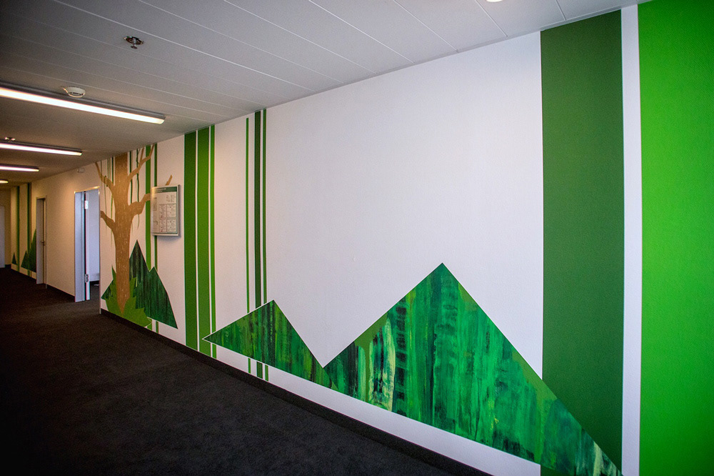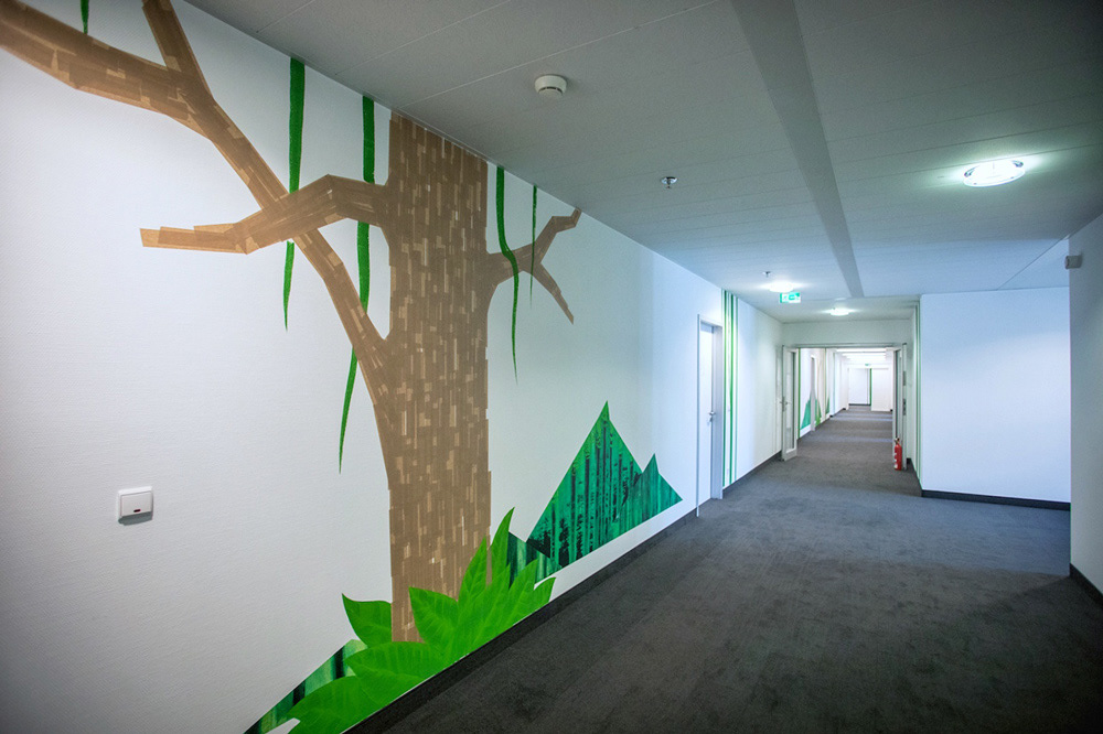This is floor 4 inside H:32 - an office building for start-ups in the center of Berlin. We were asked to design several floors of this building. Thus, we decided to show our full artistic range. The topic of this floor is forest. We combined TAPE ART, PAINTING and SPATULA to create an organic but abstract office design.