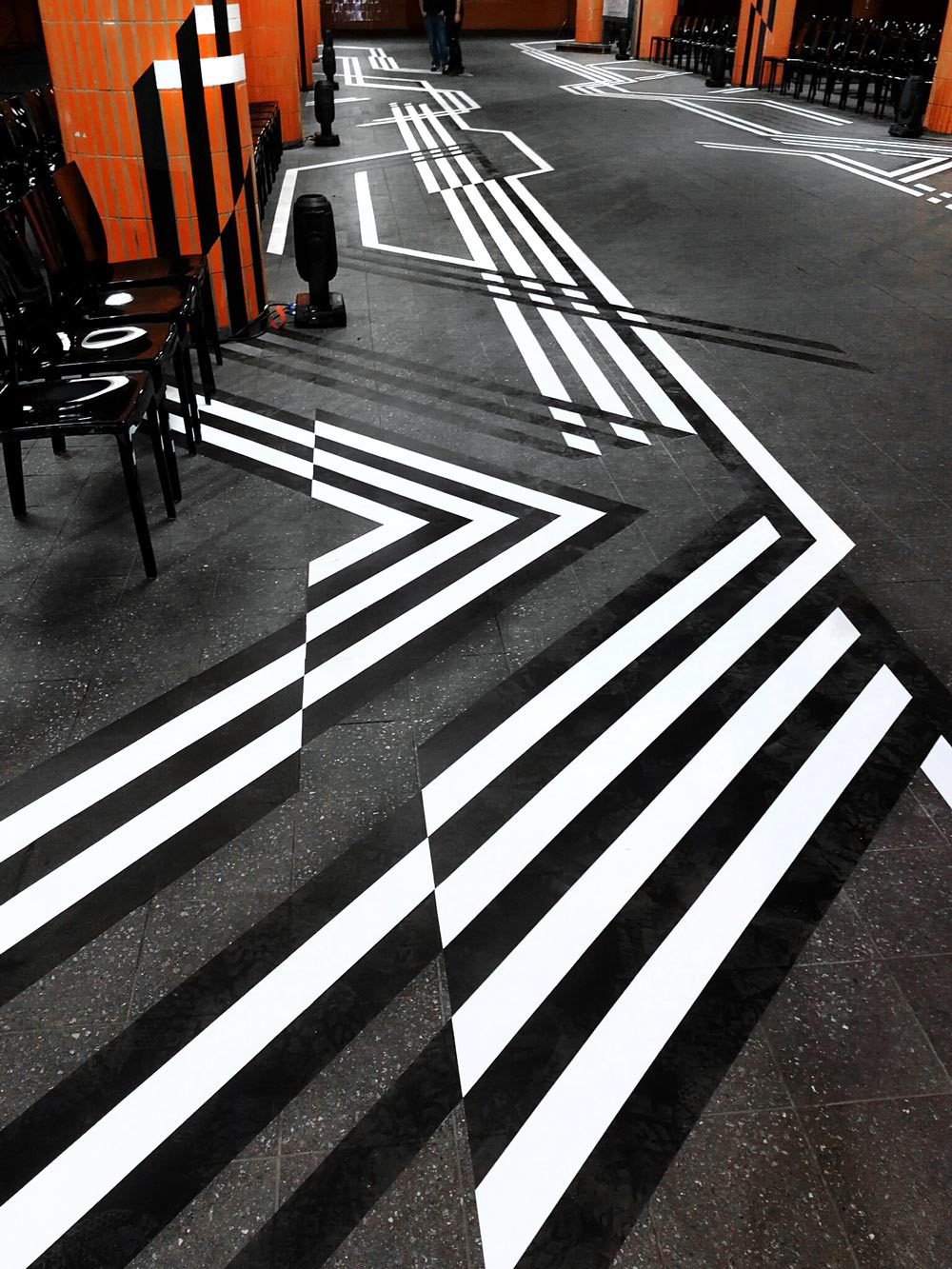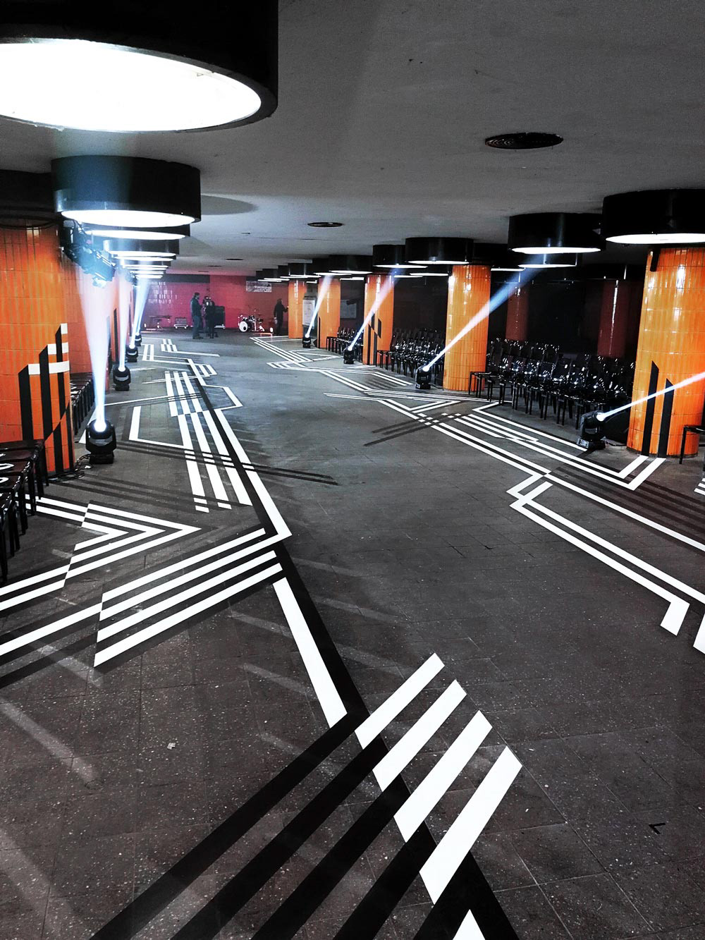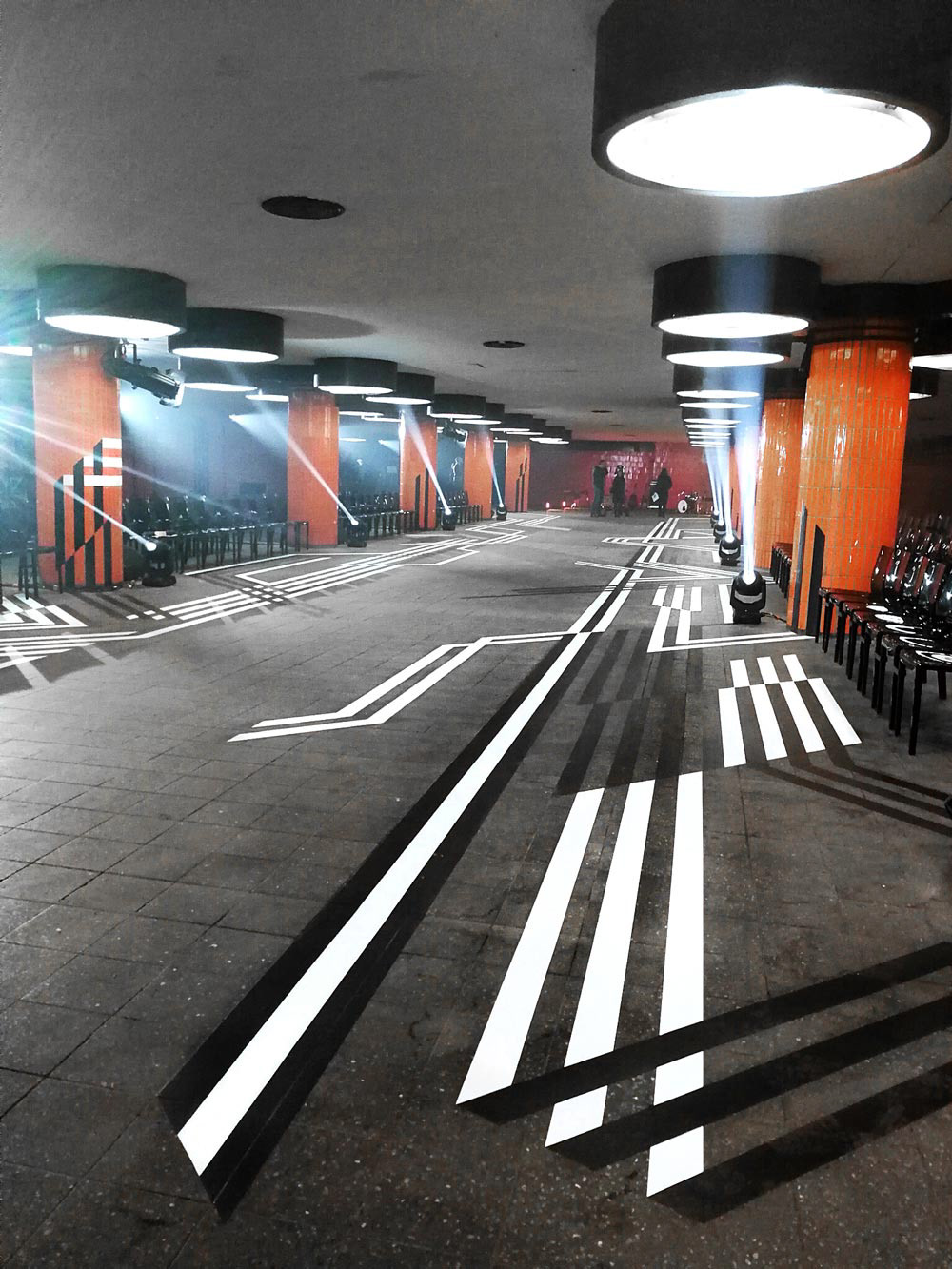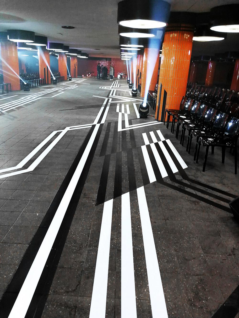 title // tape art catwalk type // tape art design size // 50x6m material // duct tape artists // LaMia & ROB & D´nice place // ICC train station in berlin / germany