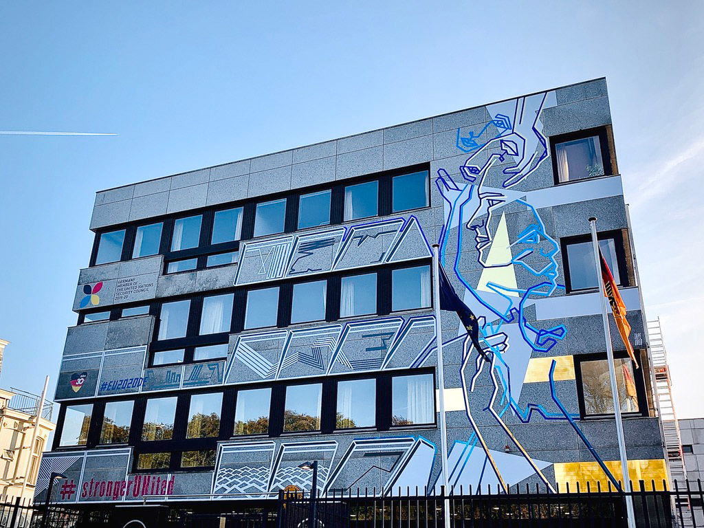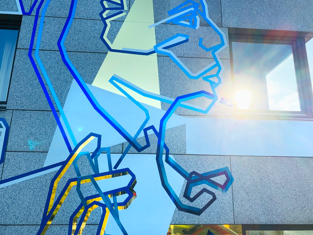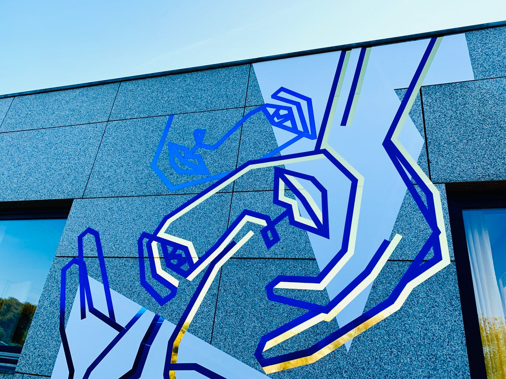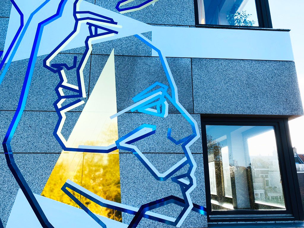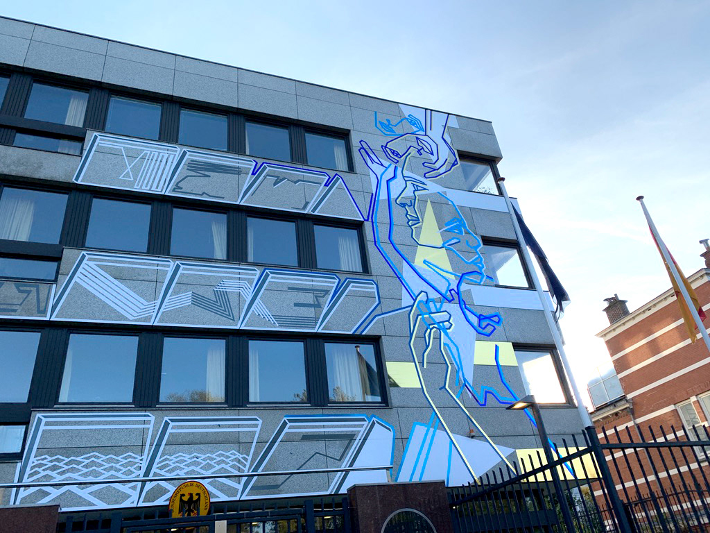 On the occasion of the 30th anniversary of the fall of the Berlin Wall, we created this permanent tape art mural on the facade of the German Embassy in The Hague. We used different adhesive foils from ASLAN.