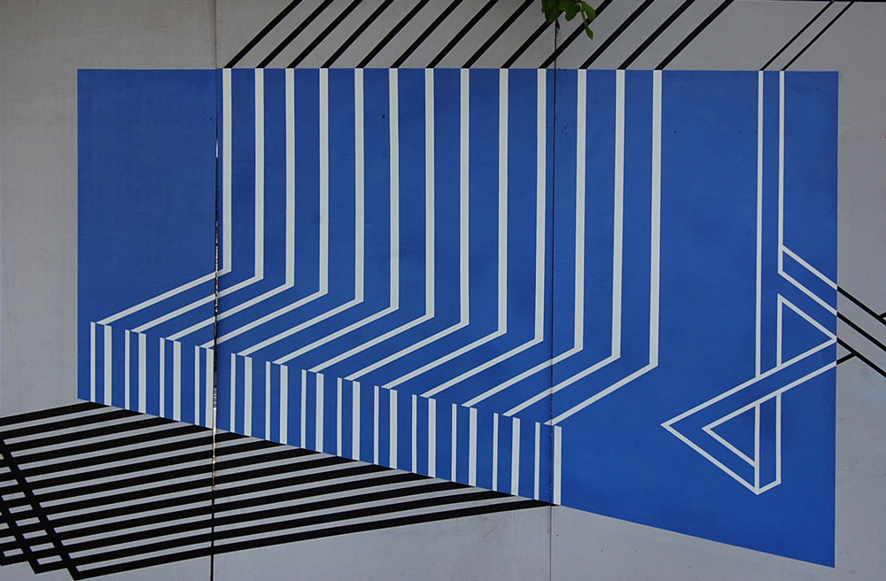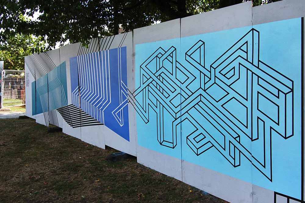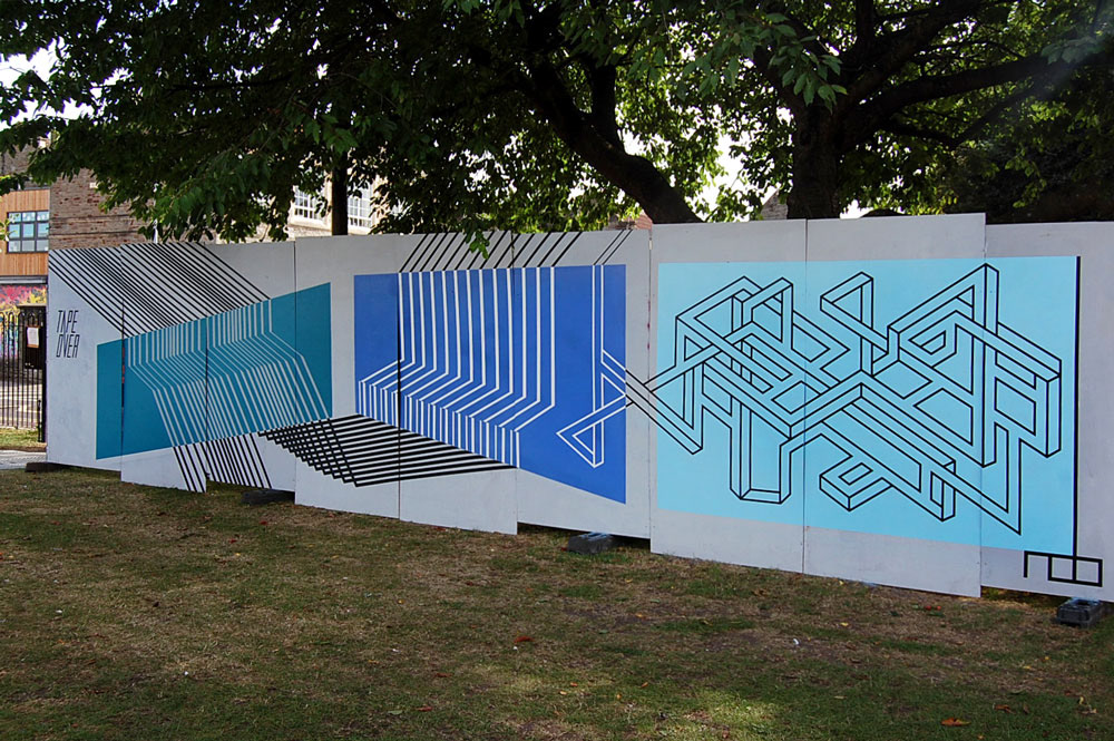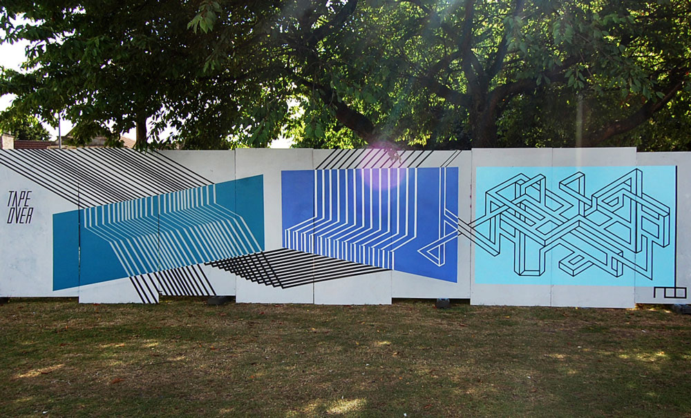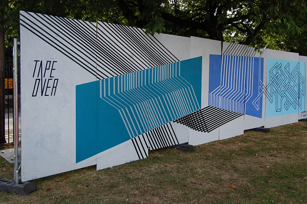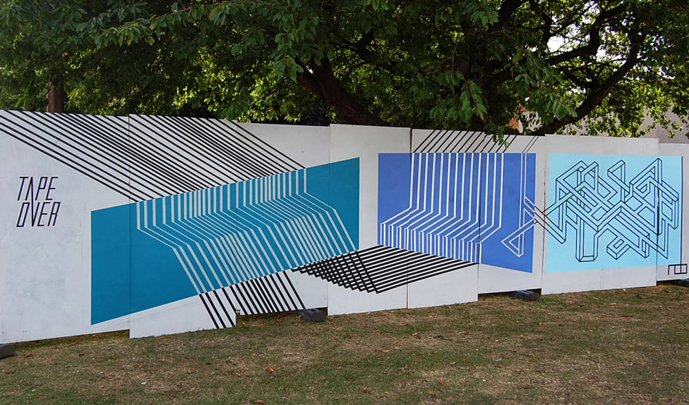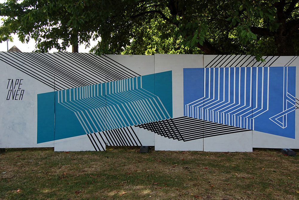 This 11m tape art mural was created at Upfest - Urban Art Festival in Britol / UK. It is a composition of lines & shapes, which looks very neat & fresh. This abstract tapeart style stood out from the crowd, because of the sharp lines and very graphic look & feel. It was the very first time that a piece of tape art was created at Europe's largest street art & graffiti festival.