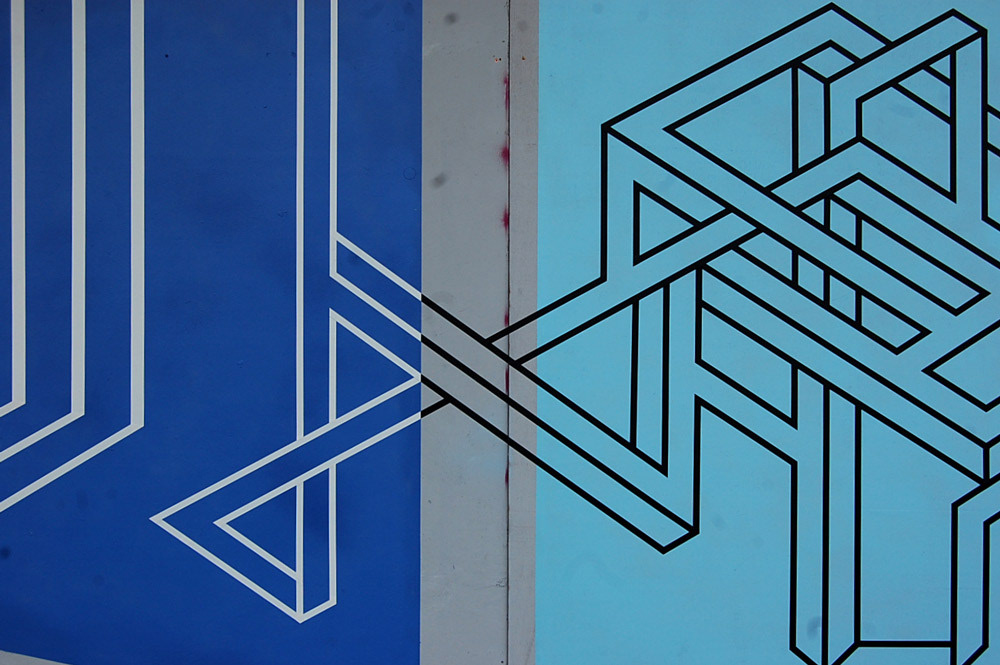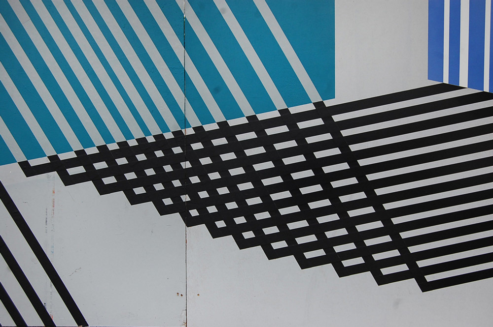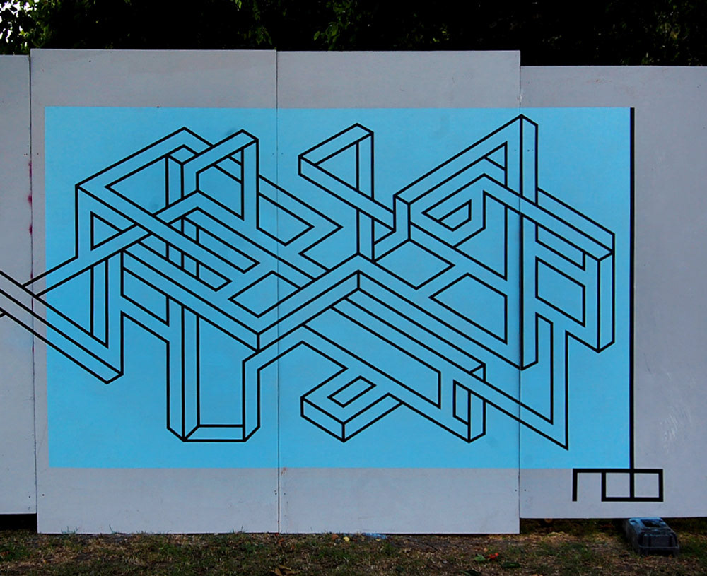 ROB had a vision of a continuous but nevertheless changing pattern. The colored areas formed the basis to create a tape art pattern which plays with perspectives and perception. Especially the right part was clearly inspired by M.C. Escher. The implementation of this concept was a cooperation between ROB and Ben Farquhar, a newcomer from Bristol/UK.