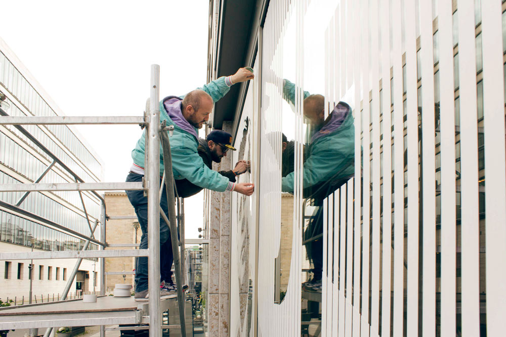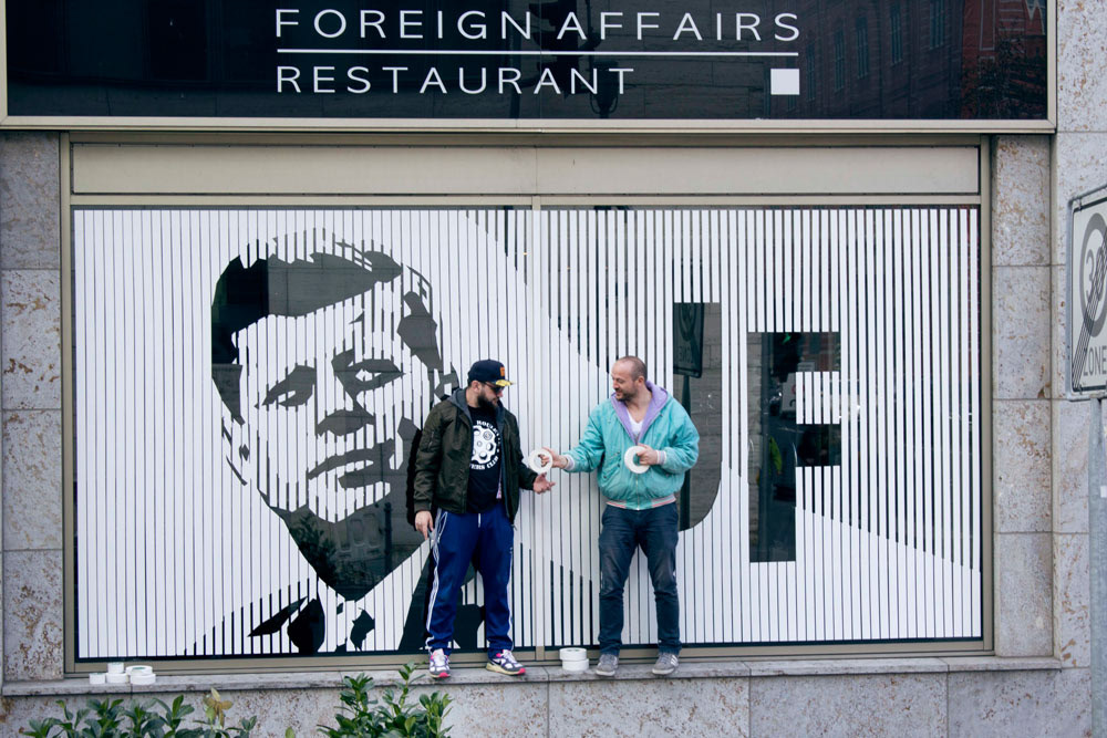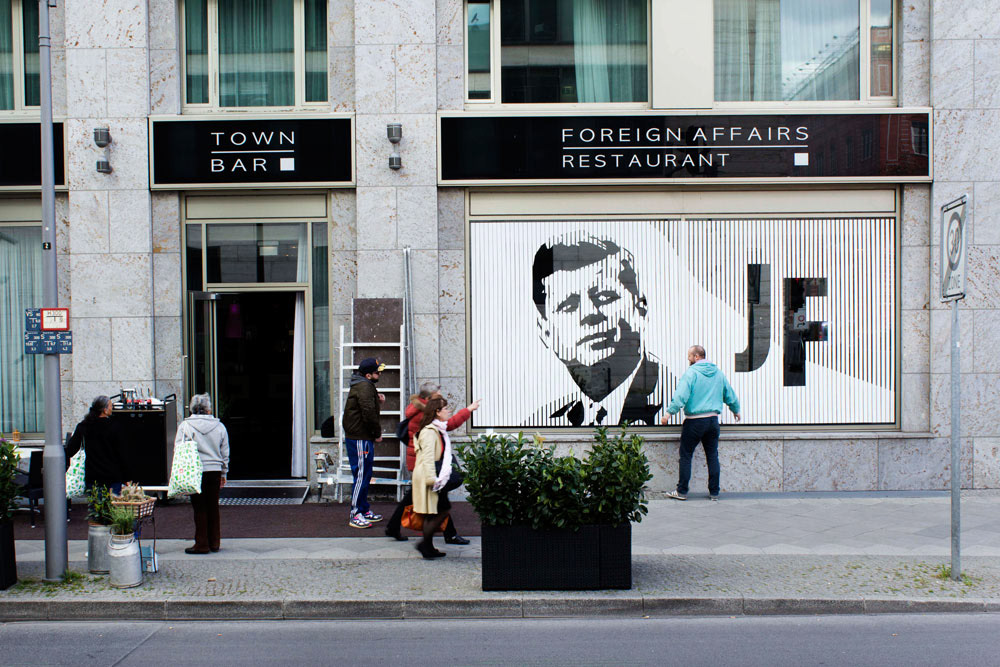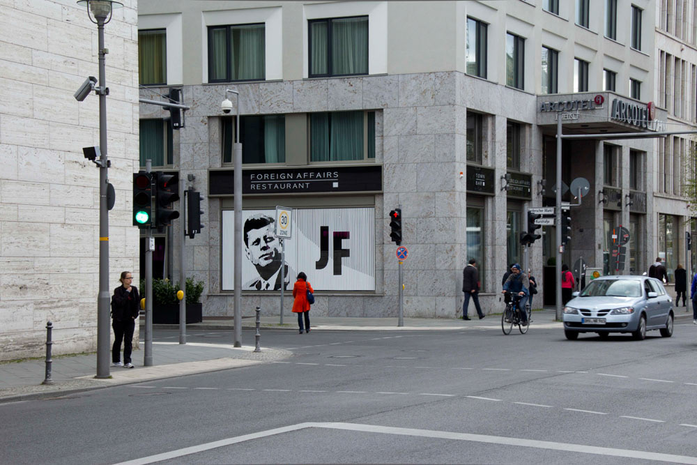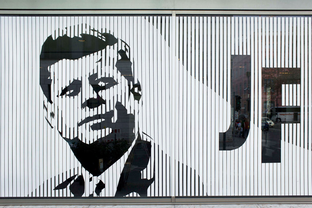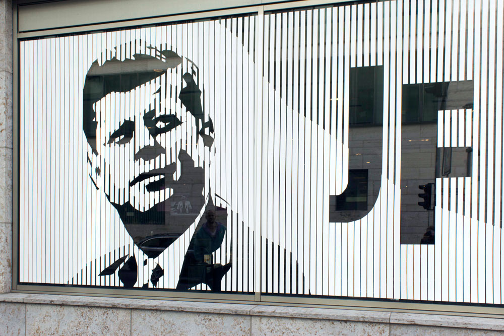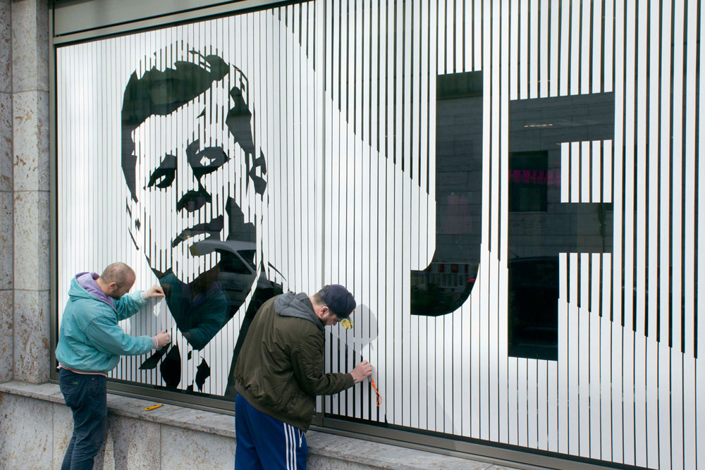 This is a tape art portrait of John F. Kennedy, which we created on two square windows (each 2,60m x 2,60m). We used a minimalistic technique for this special design. In fact, this portrait is made of white duct tape in two different width.