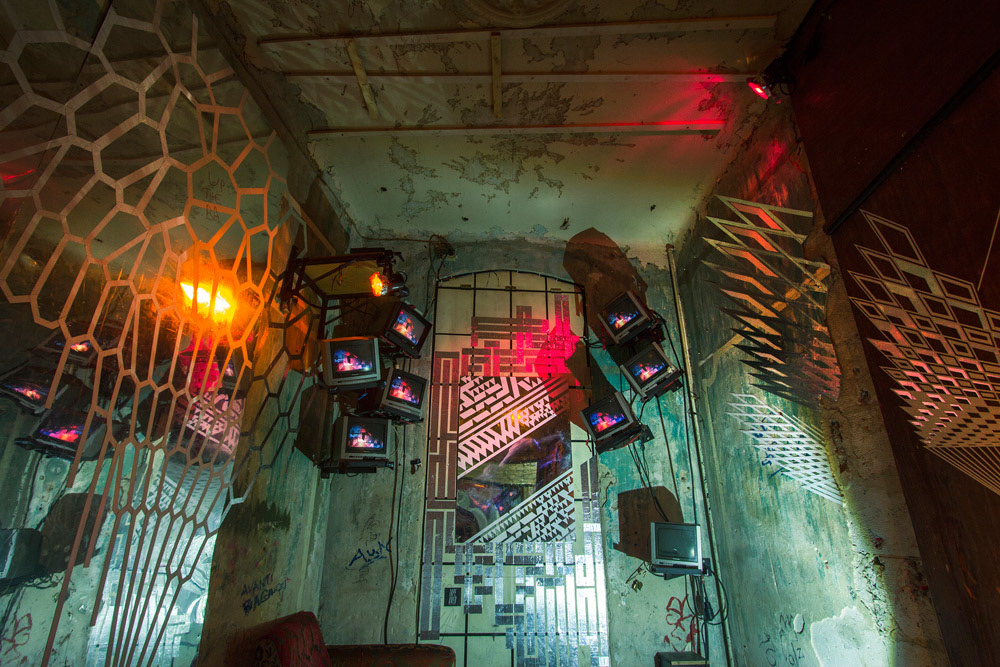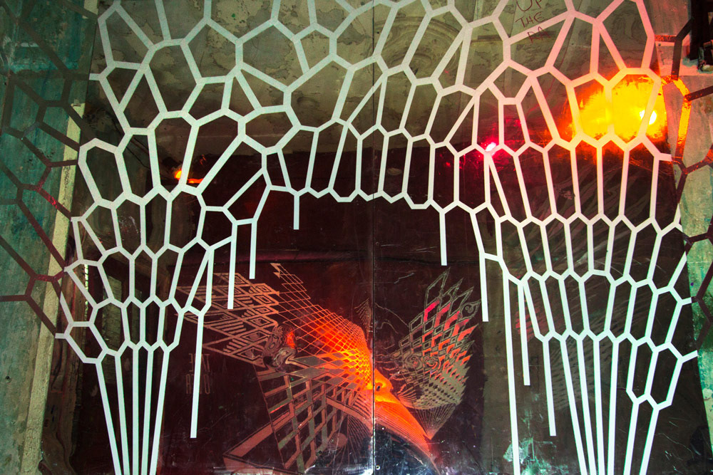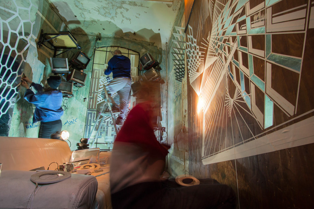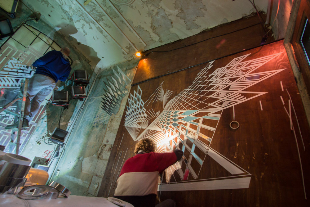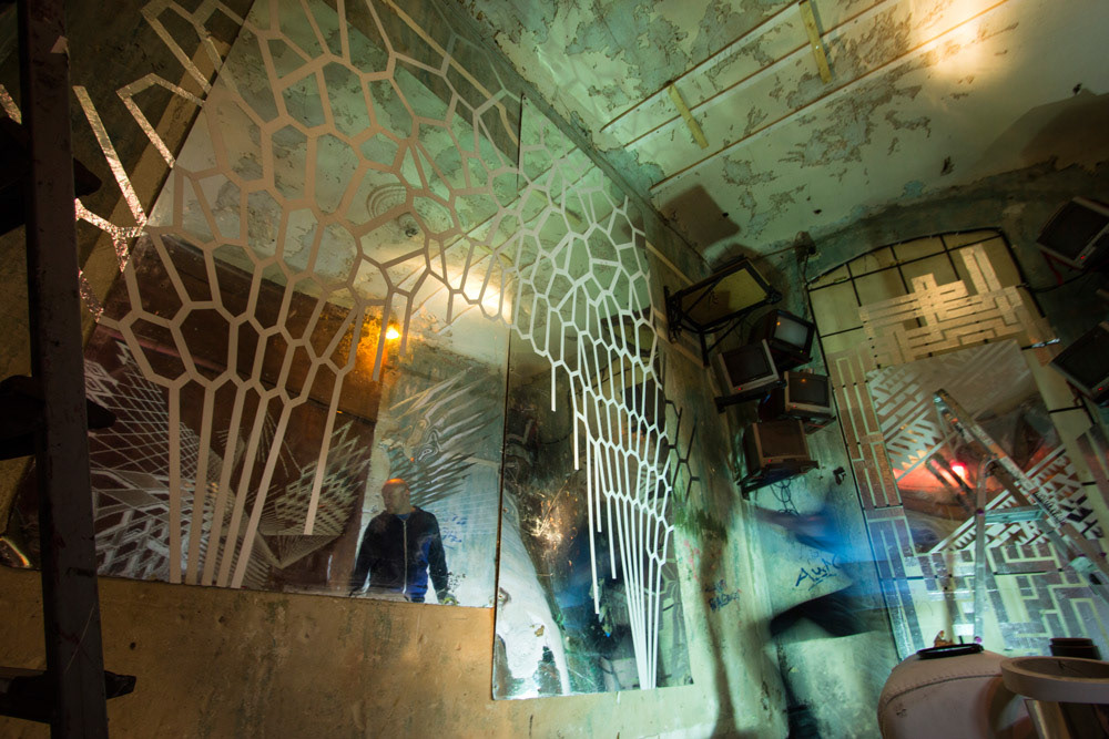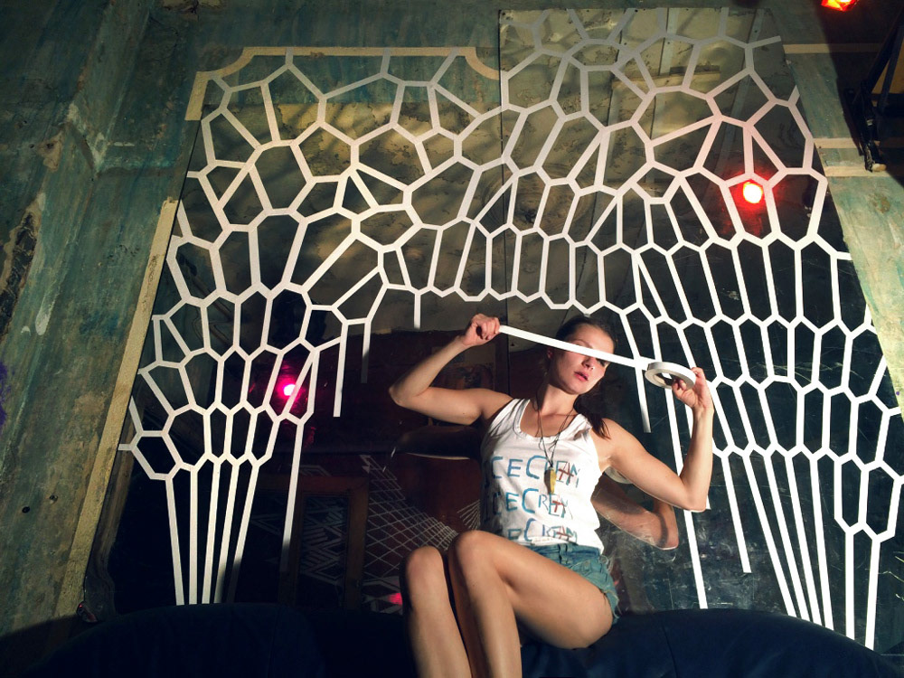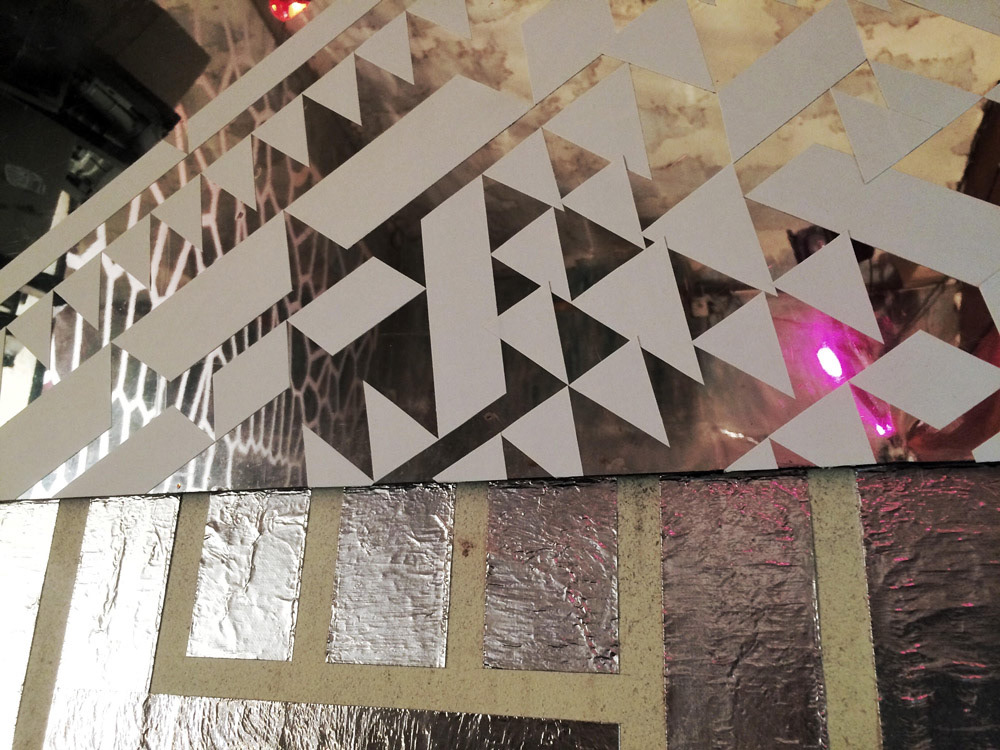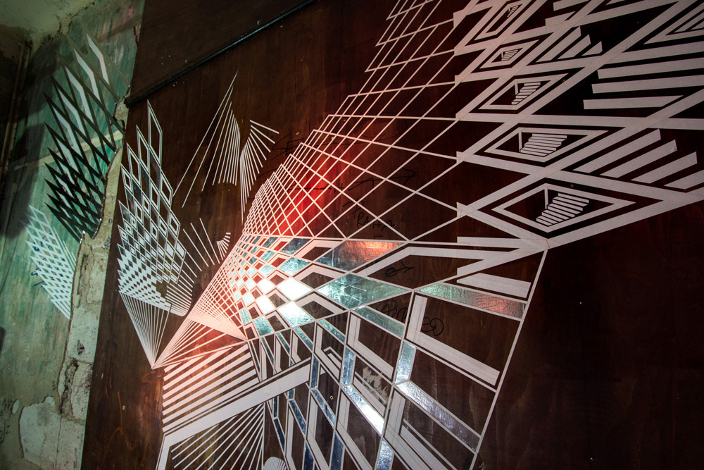 titel // in illusion we trust type // tape art installation size // 20sqm room material // white & aluminum duct tape artists // LaMia & ROB & MR GALLE place // club wilde renate in berlin / germany