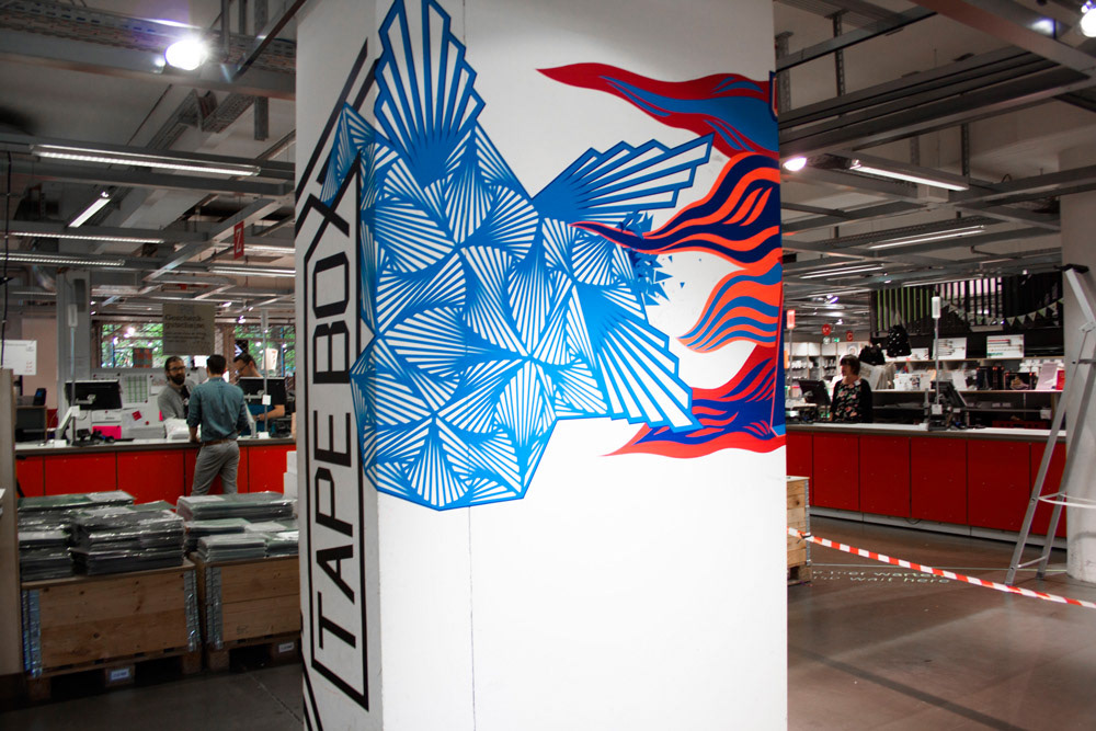 title // tape art showcase type // tape art mural size // column 3x2x1m material // duct tape & crepe tape artists // LaMia & Joshua Lee & MR GALLE place // berlin / germany