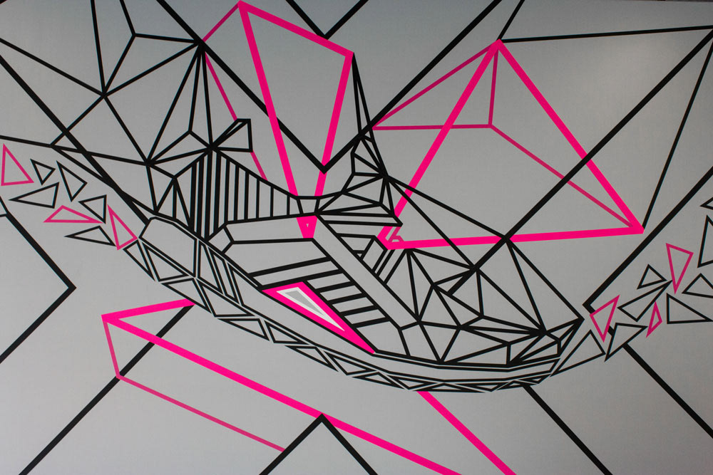 We created this tape art mural for adidas. It is a product artwork of the new running shoe called PURE BOOST X. Because we did this for the global launch campaign of this shoe, we combined tape art and video mapping to present the product.
