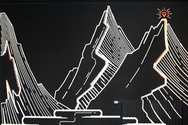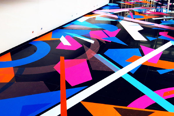 The flying magical crystals were created on awhite canvas 2m high and 4m wide with black, blue, orange and pink tape.