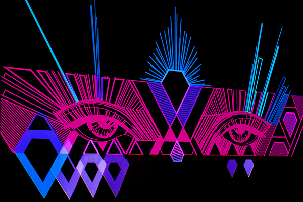 Our 3D tape mapping installation was createdas a live tapeart mural during the daytime, and by night the crystals werebought to life containing all the awe inspiring colors of a real crystal,suspended in mid-air.