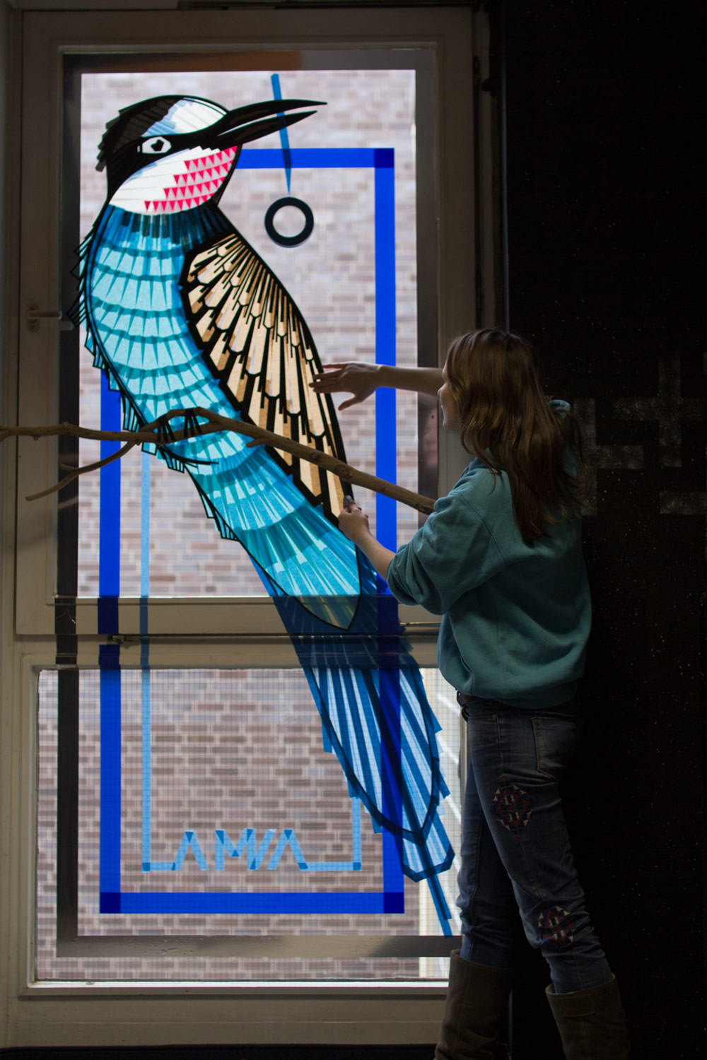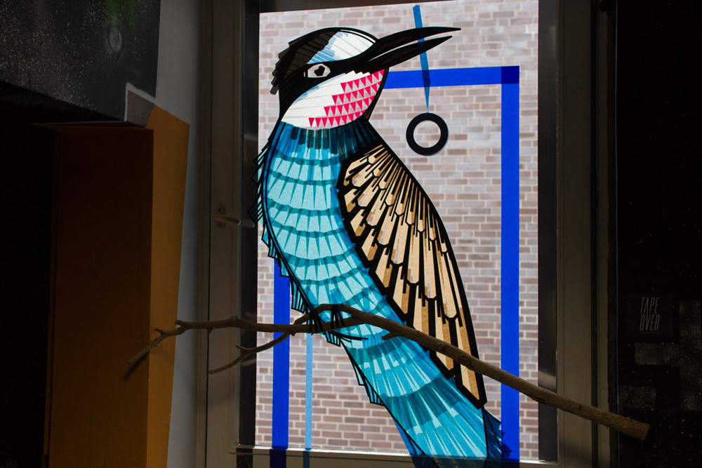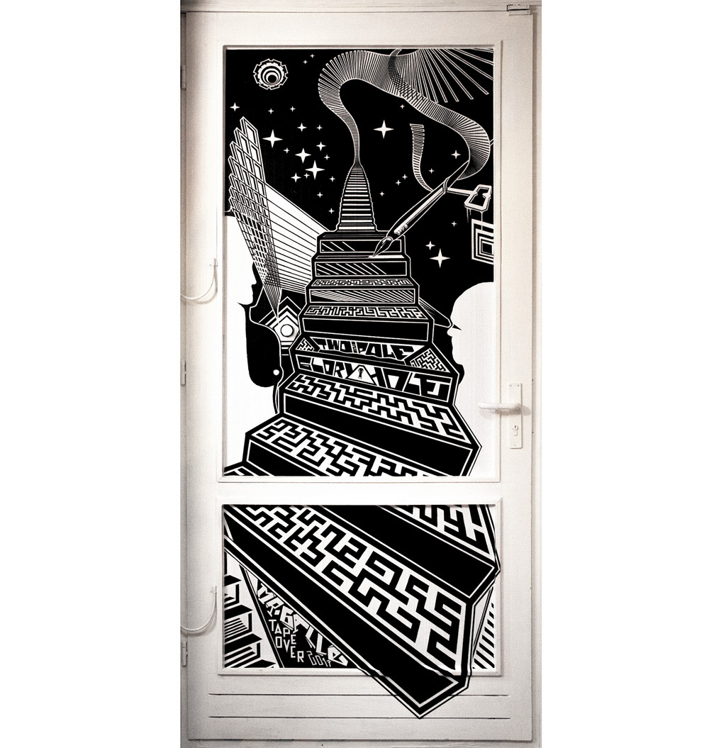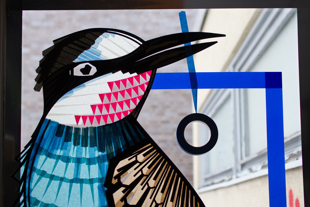 title // tape eater & 2 pole glory hole type // tape art pieces size // 2 windows each 3x1.5m material // duct tape & spray paint artists // ROB & MIC & MR GALLE & TRUS place // ihk in frankfurt / germany