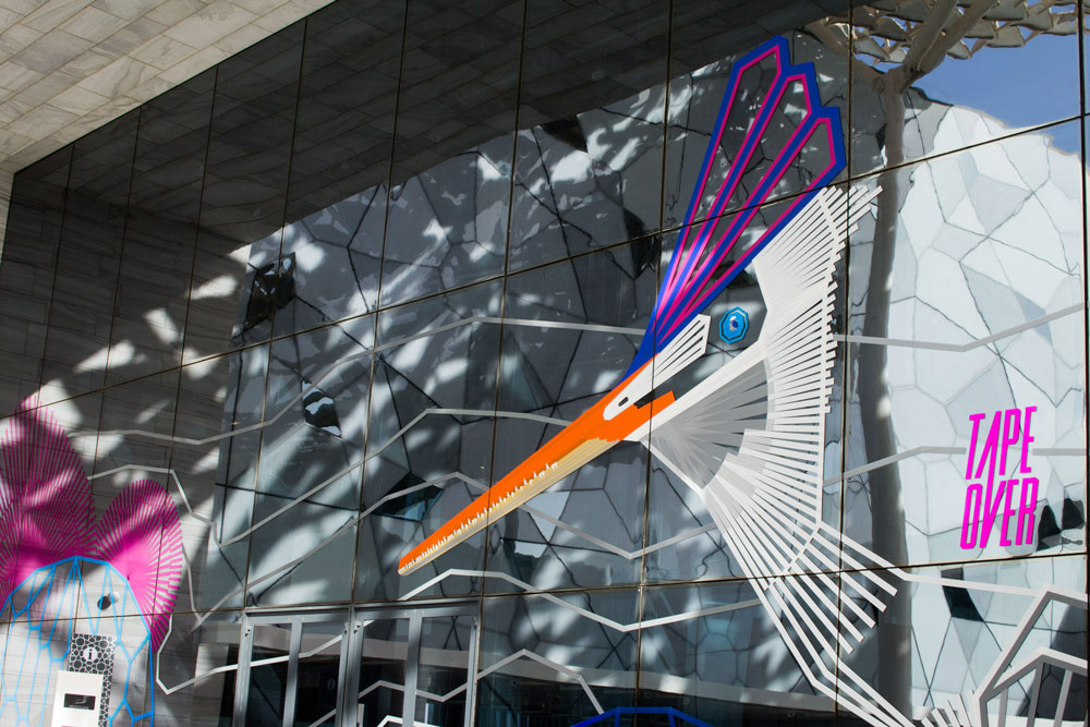 title // dinosaur type // permanent tape art window mural size // 30x10m material // adhesive foil artists // LaMia & ENNI & MIC & Mischka place // museum of natural history in kuwait city / kuwait